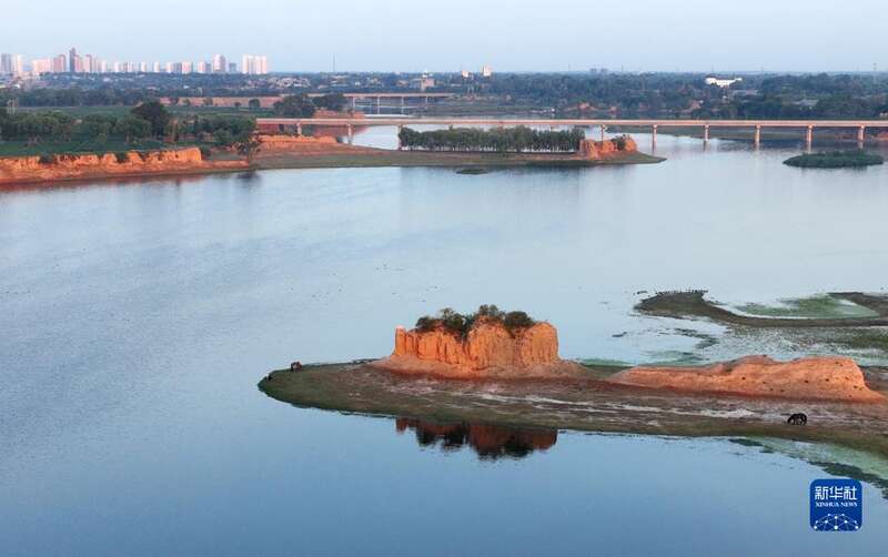 6月20日,朝霞照耀在宽阔清澈的芦河河面,远处是靖边县城(无人机照片)。