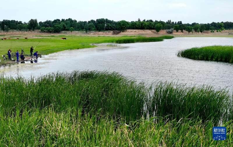 6月19日,市民在芦河河滩上休闲垂钓(无人机照片)。