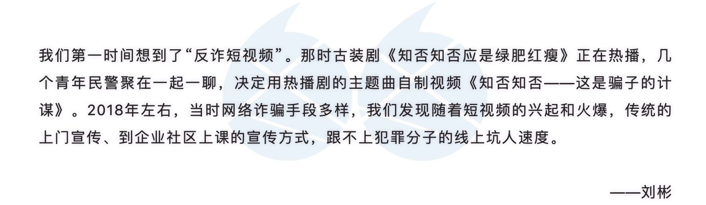 “我们的反诈网红小视频,就是要用大家看得进去、能记住的方式,给他们传递哪怕一点点反诈意识。多一个人懂一点点,少一个人被骗,都是好的。”刘彬说。
