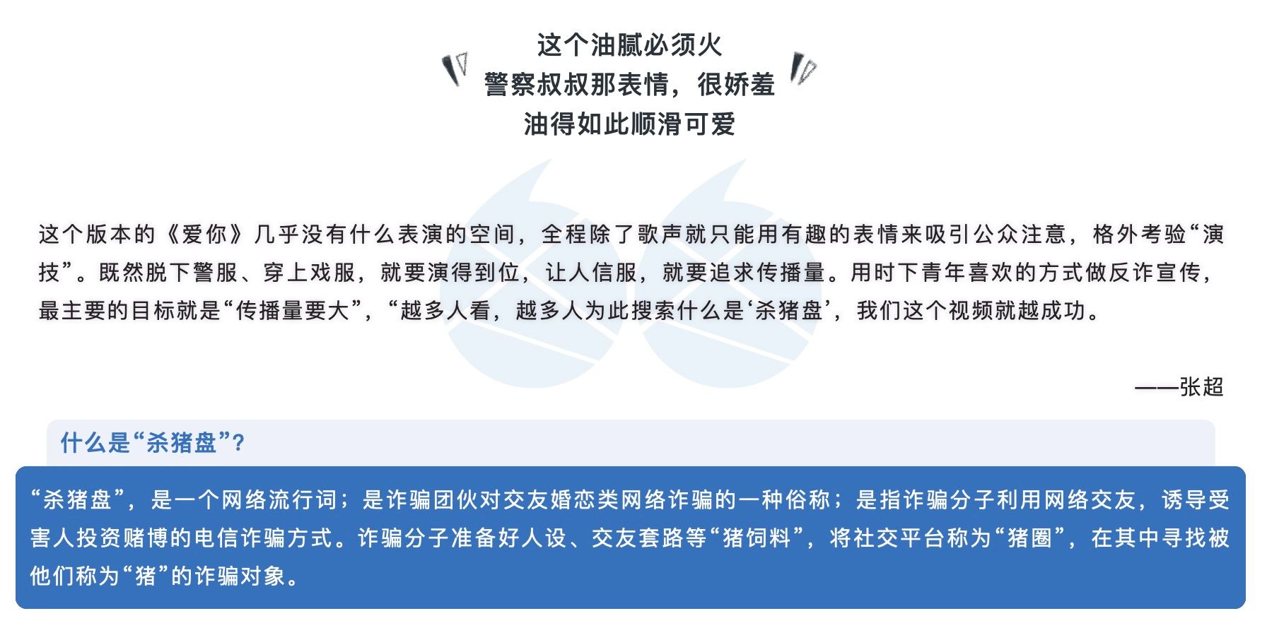 上海奉贤分局“网红宣传小队”又出“新歌”了,一部“杀猪盘”版的《爱你》在各大互联网平台上收获了过亿次的点击浏览,跟着中青报·中青网记者的来看看这群“公安戏精们”有着怎样的故事吧!
