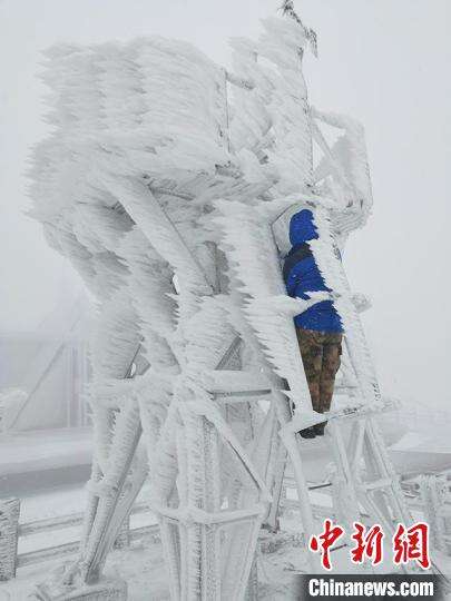矫祥肇为气象设备除冰。(资料图) 受访者供图