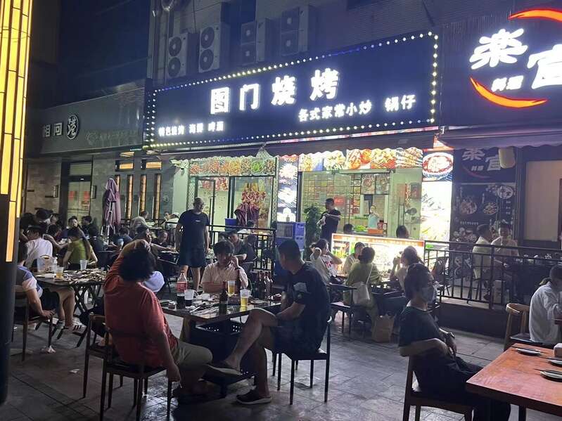 洪程栋注意到,一些餐饮店因为不能堂食,就把店里的凳子搬出来,作为外摆,有些顾客干脆席地而坐,或者在路边台阶上吃。比如宝山大华虎城很多烧烤店就在店门前摆放了不少桌椅。天钥桥路一带也有一些烧烤店,将凳子搬出来,供食客们在外面烧烤。
