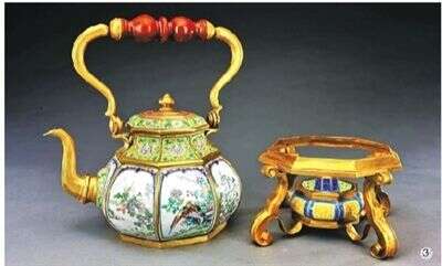 画珐琅八棱开光山水花鸟图提梁壶。(资料图片)