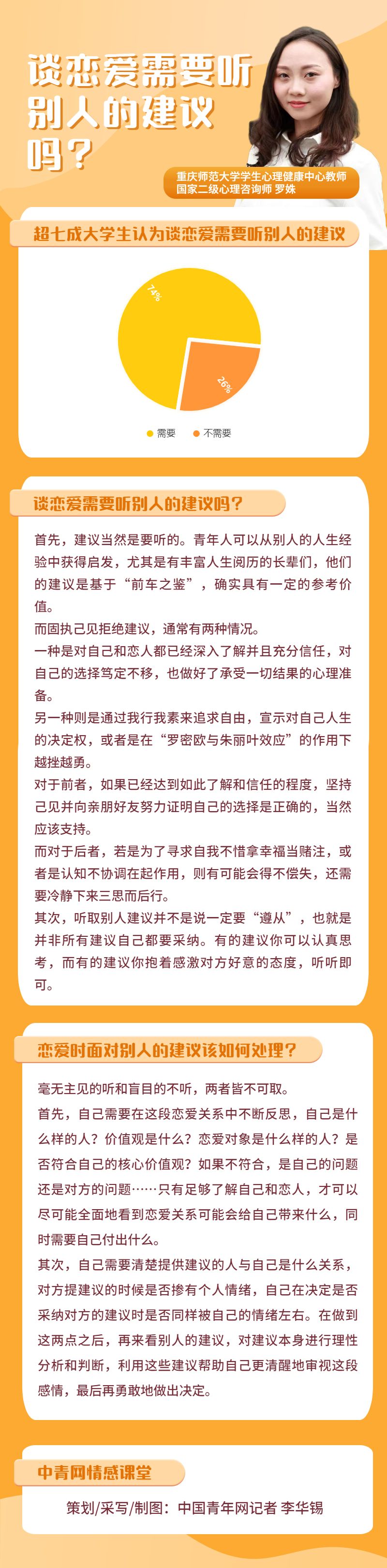 重庆师范大学学生心理健康教育与咨询中心专职教师、国家二级心理咨询师罗姝认为,关于谈恋爱要不要听别人的建议,很多青年都有过类似的困惑。