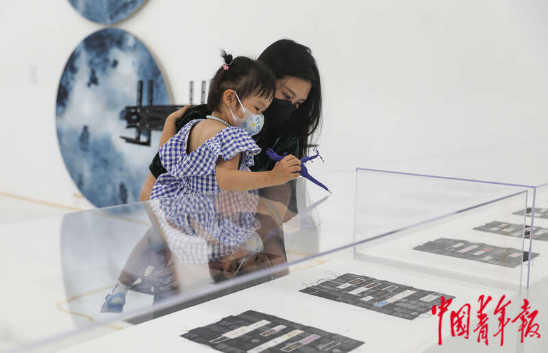 6月24日,北京798艺术区东京画廊,一名小朋友在妈妈的带领下观看中国艺术家徐冰的作品《小企业七言集》。这件作品是由艺术家多年收集的几万个来自民营小企业的服装品牌标签,通过“写诗软件”电脑程序在众多标签中搜索出合适的词句,拼出“七言诗”,并调整、汇集成册。中青报·中青网记者 孔斯琪/摄