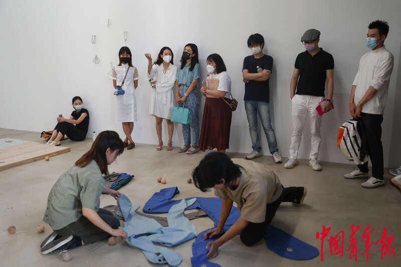 6月24日,北京798艺术区户尔空间,参观者在观看法国艺术家范尼·吉奎尔作品的现场表演。在3个小时连续不断的表演中,现场观众可以近距离感受这些雕塑和装置作品是如何被表演者的身体动作所“激活”的。中青报·中青网记者 孔斯琪/摄