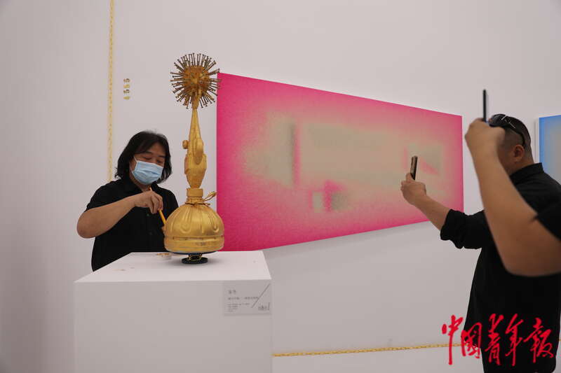 6月24日,北京798艺术区北京公社,参观者在中国艺术家梁远苇的作品前驻足观看。中青报·中青网记者 孔斯琪/摄