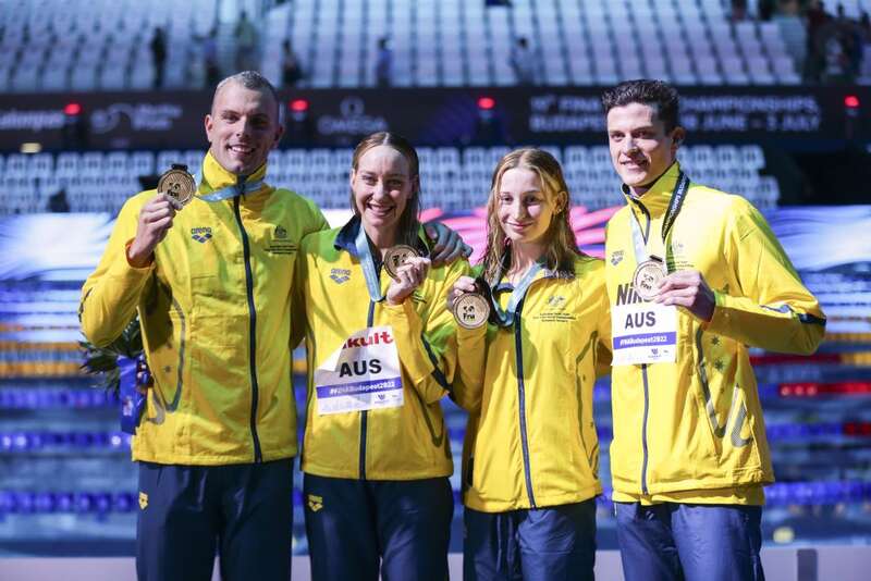 6月24日,男女4x100米自由泳接力决赛中,由卡特赖特、查默斯、威尔逊和奥卡拉汉组成的澳大利亚队以3分19秒38的成绩打破世界纪录并夺冠。新华社记者郑焕松摄