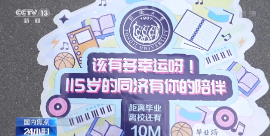 在同济大学各个校区出口的50m处,可爱的喵咪形象,温馨的离别话语,这些图文并茂的“毕业祝福地贴”让人眼前一亮。今年恰逢同济大学115周年校庆,校门口10米处还特别设置了感谢“遇见”的祝福语。