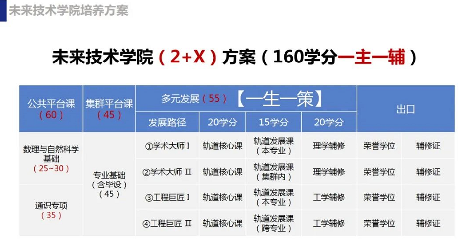 大一公共基础平台课程(厚植数理、自然科学基础);大二方向领域平台(人工智能领域、智能制造领域、生命健康三大领域);大三轨道方向核心课程;大四轨道方向选修课程(目标驱动的特色化发展课程)。学生修够160学分即可获得主辅修的毕业证和学位证,同时获得英才学院荣誉学位。本科毕业后有机会推荐至国际知名高校攻读研究生。