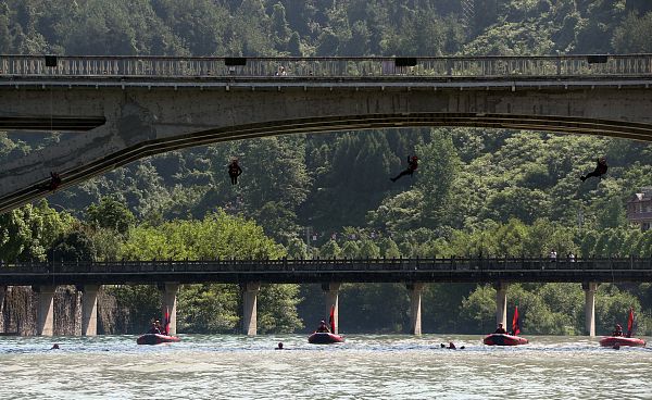 上午9时30分,指挥部下达演练开始命令,来自州消防救援支队机关、特勤站和8个县市消防救援大队的84名消防指战员,携带3艘冲锋舟、12艘橡皮艇,以及救生衣、救生圈、无人机、水上飞翼、水陆两栖车、绳索救援套装等水域救援装备,组成综合协调组、抢险救援组、现场监测组、急救防疫组、通信保障组、政工监察组、后勤保障组,迅速赶赴宣恩县贡水河莲花坝大桥河段集结,并现场搭建前沿指挥部。公安、交警、医疗、气象、矿山综合应急救援队等社会联动力量到场协助。