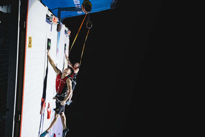 1日晚,有4名中国选手进入男子前16名,曹龙在八进四轮中出发失误负于队友龙金宝。四强战中,伍鹏以0.04秒的微弱优势淘汰印尼选手莱昂纳多,与队友龙见国会师决赛。最终,龙见国决赛爬出5秒23,仅领先伍鹏0.01秒惊险夺冠。