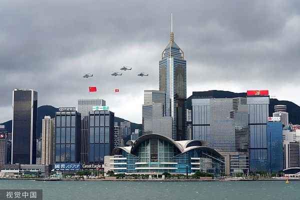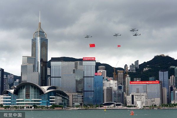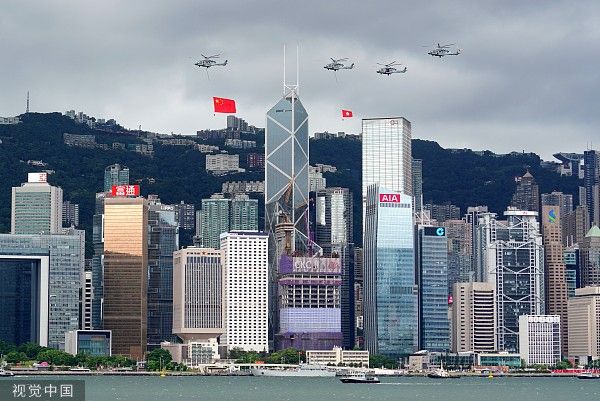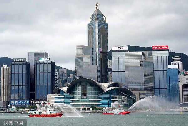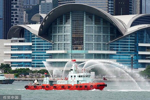 2022年7月1日早晨,香港特区政府庆祝香港回归祖国25周年升旗仪式在金紫荆广场举行,消防处灭火轮在维港海面喷洒水柱致礼。 中新社记者 张炜 摄