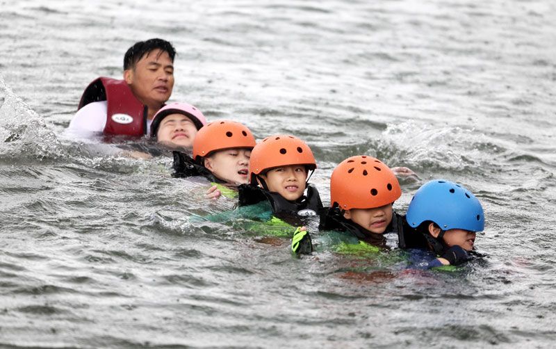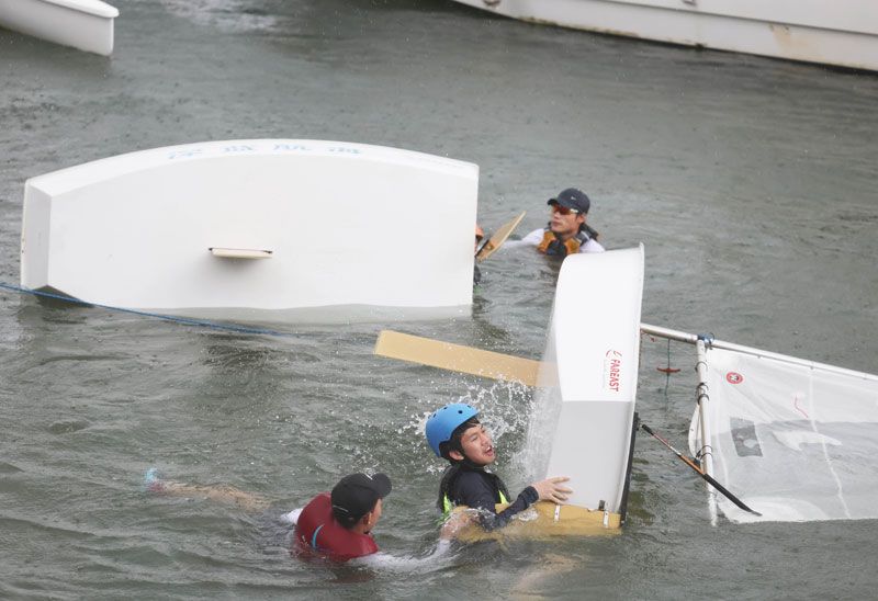 小水手们在教练的指导下,进行船只海上翻覆训练。
