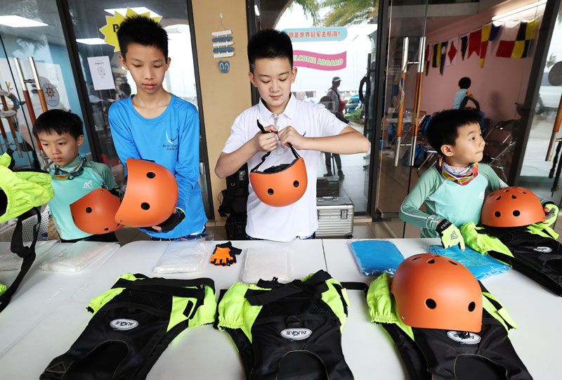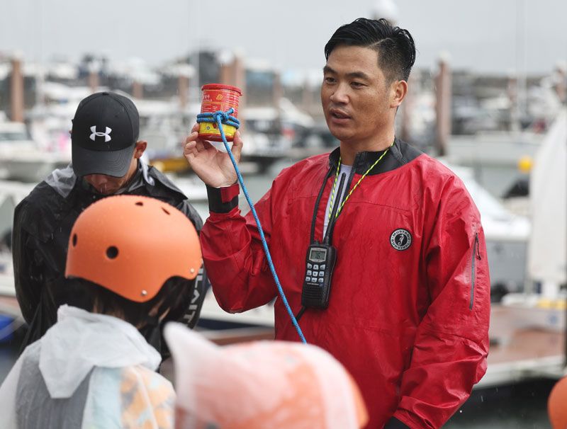 帆船世界冠军刘明(左一)指导小水手们进行海上伤员营救训练。