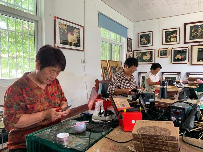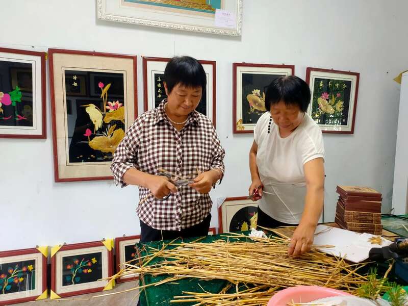孙庄村的村民正在按照选材、剪段、浸泡、剖开等12道工序制作麦秆画。(受访者供图)