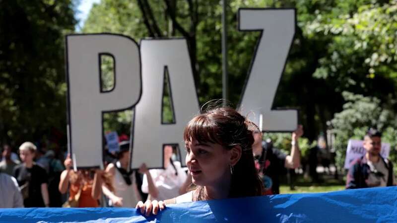 这是6月26日在西班牙马德里拍摄的游行现场。数千人26日在西班牙首都马德里市中心参加反对北约、呼吁世界和平大游行。新华社发(胡安·卡洛斯·罗哈斯摄)