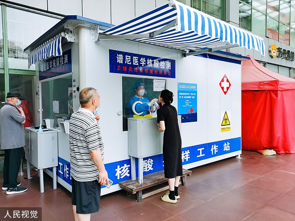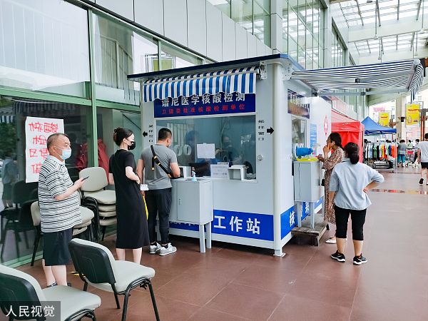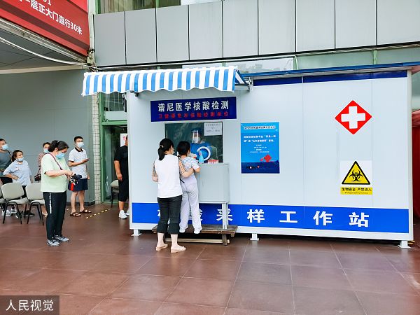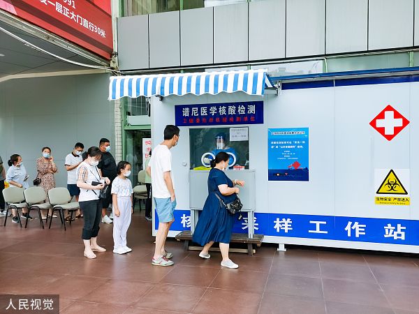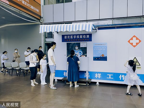 2022年7月2日,青岛,在市南区一处核酸采样点,市民排队做核酸检测。