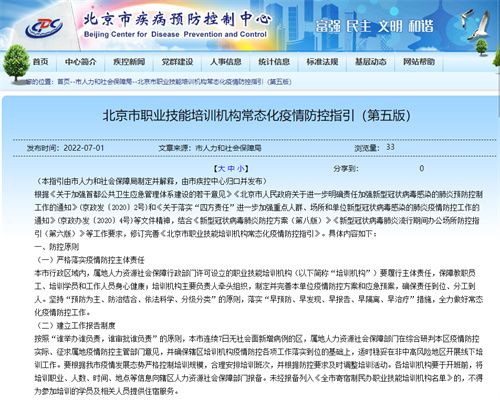 北京市疾控中心日前发布了新版《北京市职业技能培训机构常态化疫情防控指引》。14日内进(返)京人员不得参加线下职业技能培训;进(返)京人员在培训第一天须提供48小时内核酸检测阴性证明。
