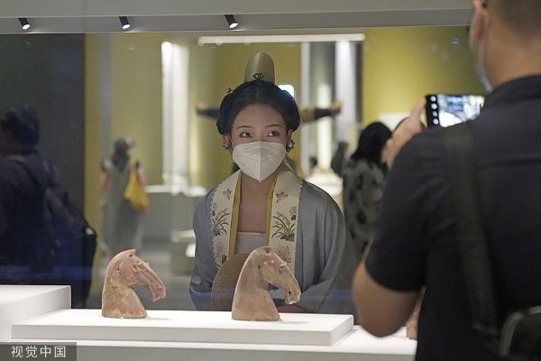 2022年7月3日,香港故宫博物院对公众开放的第一天,一名身穿中国传统服饰的游客在博物馆里拍照。博物馆展出从故宫博物院藏品中精选出来的逾900件珍贵文物,其中包括166件国家一级文物,为观众讲述中国悠久历史和灿烂文化。