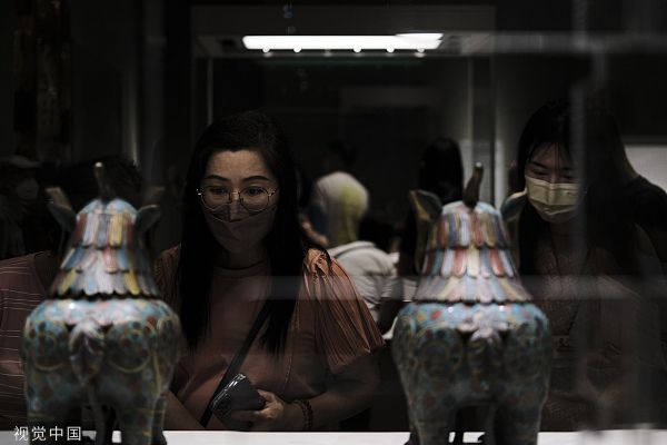 2022年7月3日,香港,香港故宫文化博物馆对外开放期间,游客在馆内参观。此次香港故宫文化博物馆展出了900多件无价之宝,其中很多都是首次在香港展出。