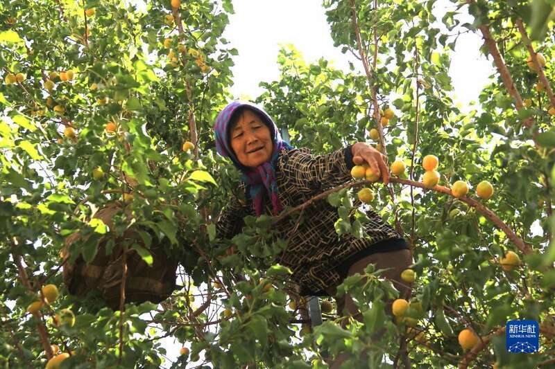 7月3日,敦煌市月牙泉镇合水村农民在采摘李广杏。