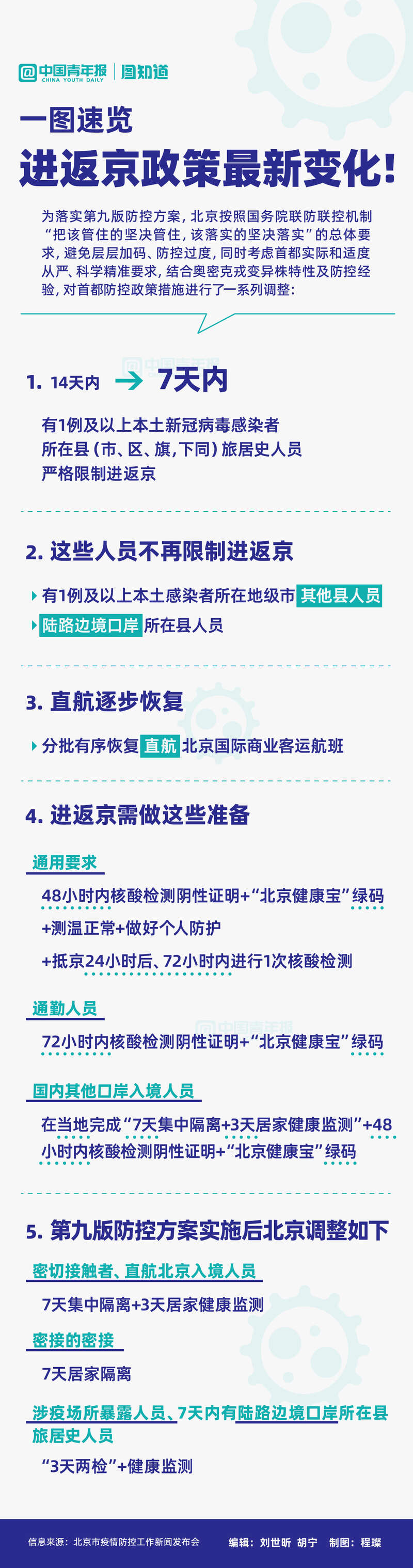 北京今天发布了新调整的防控政策,涉及进返京要求、直航恢复、其他口岸入境人员来京等细节。北京市卫健委副主任李昂介绍,相关政策调整是为落实《新型冠状病毒肺炎防控方案(第九版)》,及“把该管住的坚决管住,该落实的坚决落实”的总体要求,避免层层加码、防控过度。有哪些最新变化,一图速览️⬇
