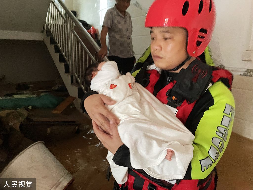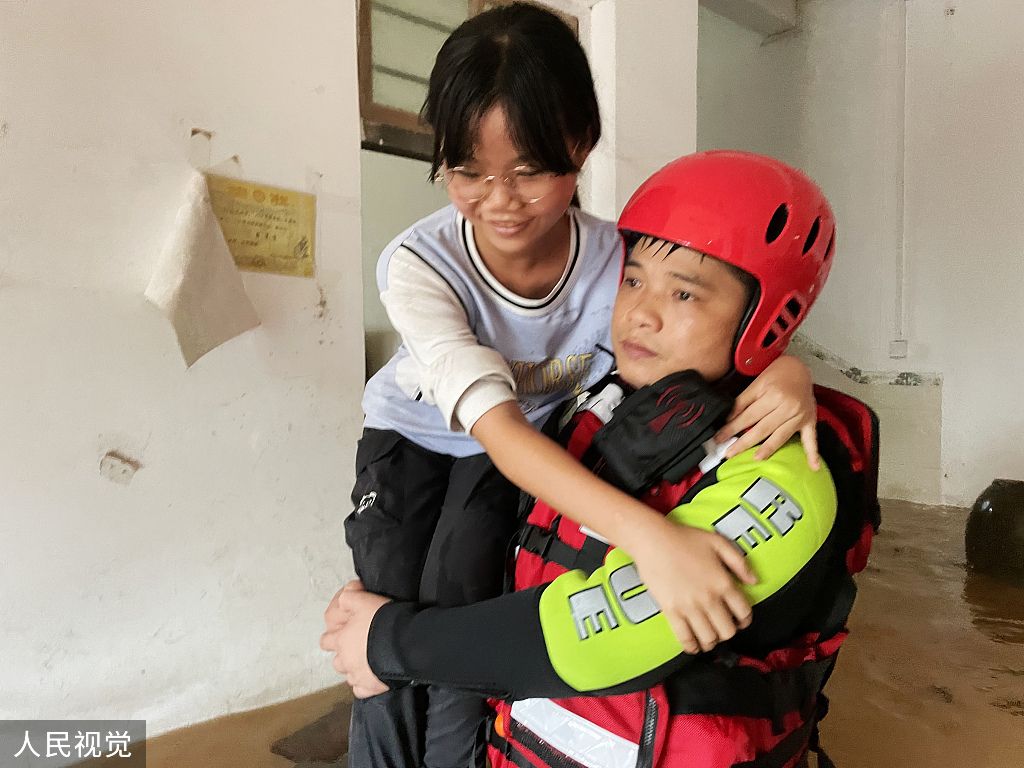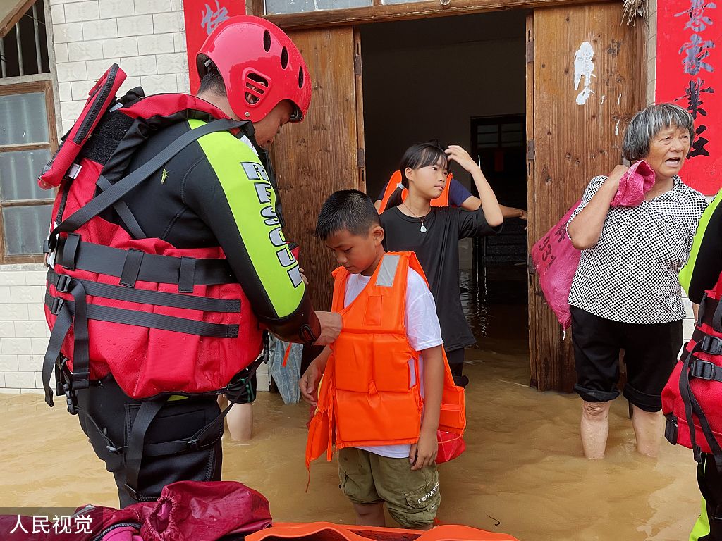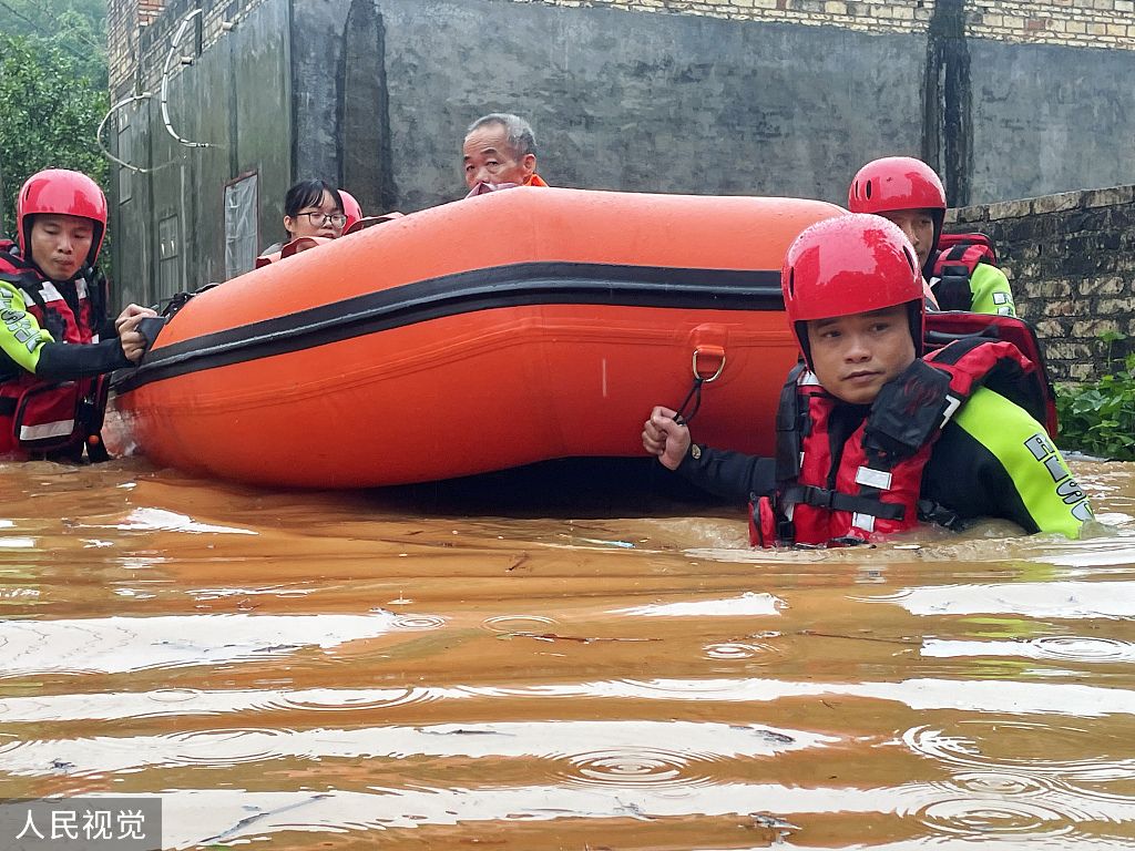 2022年7月4日,广西玉林,博白县双旺镇曾村十队遭受暴雨发生内涝,当地消防部门立即携带水域救援装备赶赴现场救援,在知情人的指引下奔赴灾区内部实施搜救。