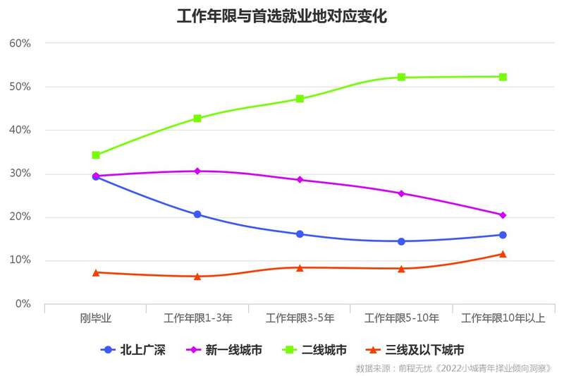 报告显示,对于家乡在二线及以下城市的受访者,即使不考虑家乡置业等因素,随着工作年限的增加,选择一线/新一线为就业首选城市的比重仍呈递减趋势。受访者中,刚毕业把一线/新一线作为首选就业地的为58.6%;工作十年以上的受访者,首选就业为一线/新一线的降至36.3%。刚毕业就把二线及以下城市作为首选就业地的受访者有41.4%,工作十年以上将二线及以下城市作为首选就业地的上升至53.8%。