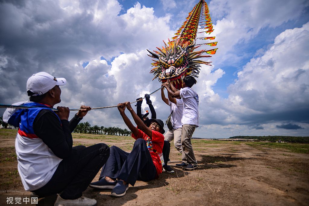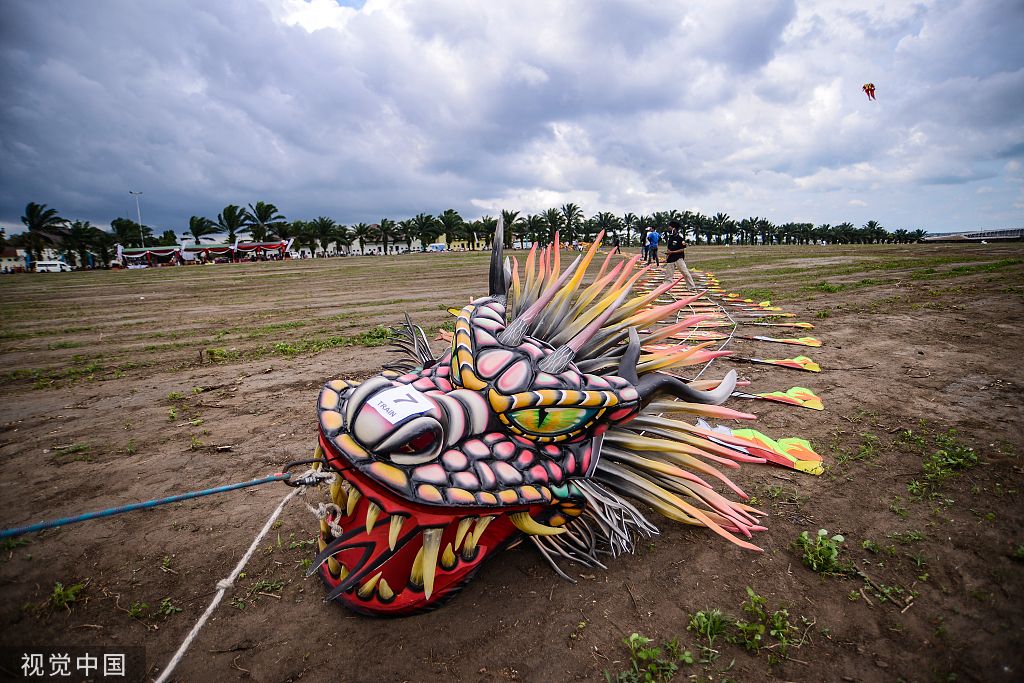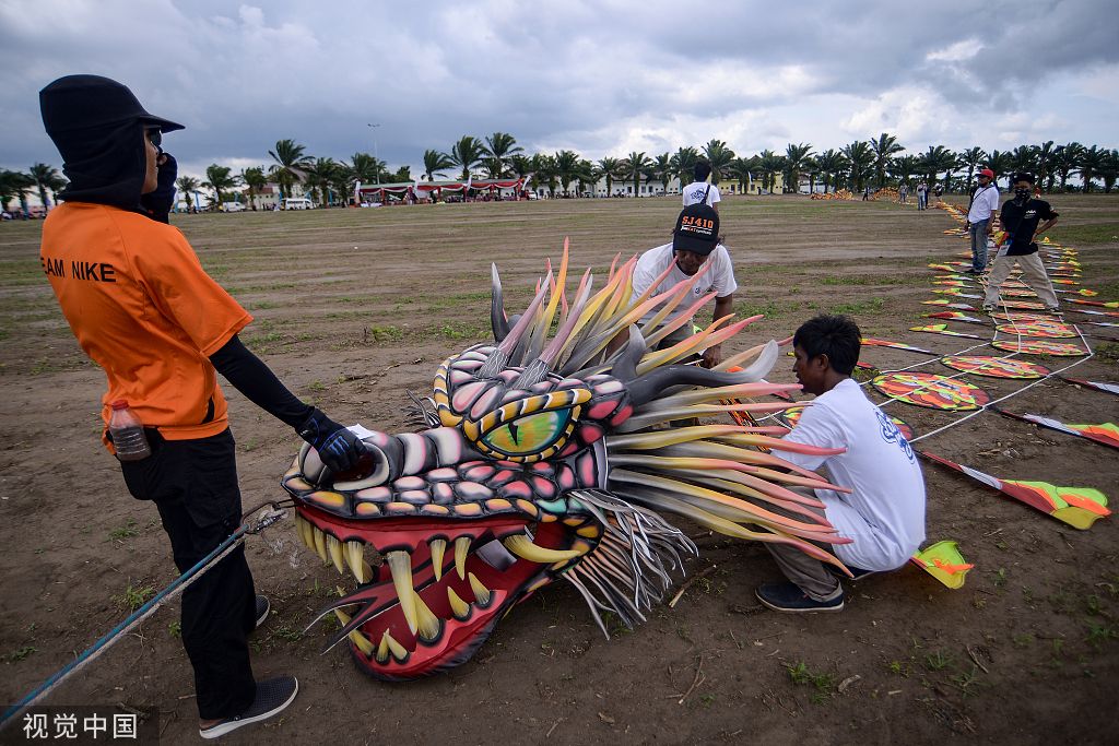 当地时间2022年7月5日,印尼南苏门答腊岛,第六届南苏门答腊岛国家休闲体育节的参与者们放飞巨龙形风筝。