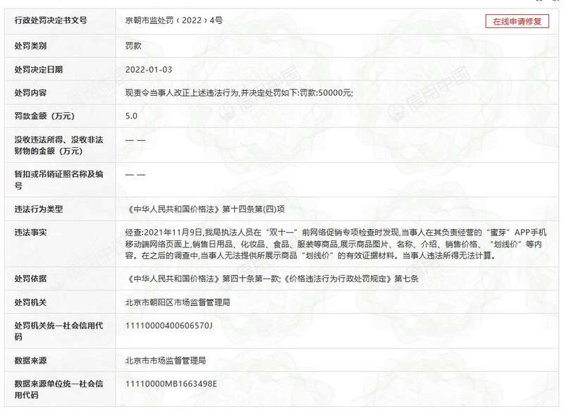 据信用中国网站显示,2022年1月3日,北京花旺在线商贸有限公司被北京市市场监督管理局罚款5万元。