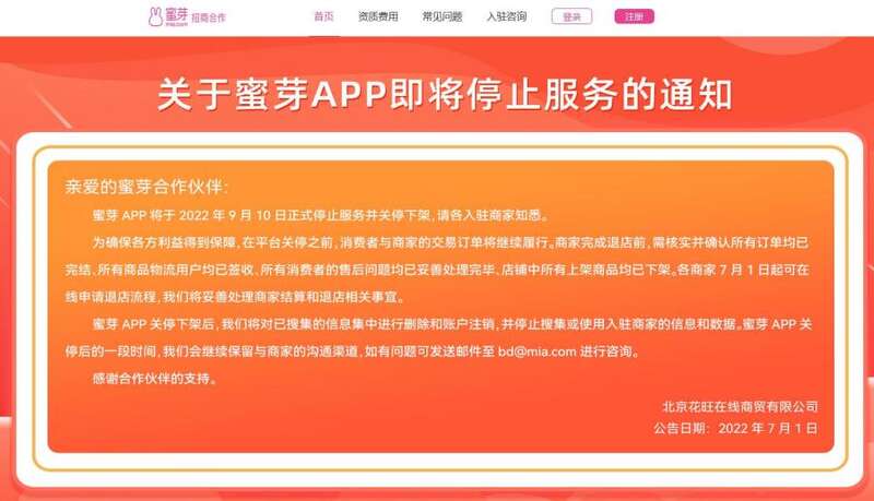 中新网7月5日电 (邵婉云)日前,母婴电商平台蜜芽官网发布公告,蜜芽APP将于9月10日正式停止服务并关停下架。