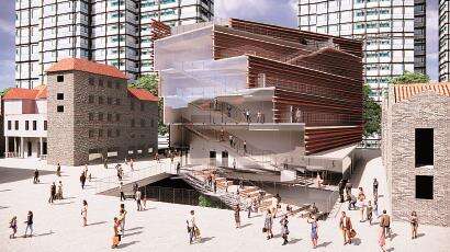 隈研吾:我们还是从张园美术馆说起。这个美术馆高达20米,建筑面积达3200平方米,算得上一个体量巨大的建筑物。为了调和与周围老建筑的关系,我们采用了扭转的方式逐渐增加建筑高度。由扭转产生的阶梯状台地自然地成为不同高度的露台,使人们能从各个角度眺望张园美景。我特别在南侧设置了整面玻璃幕墙,在内侧可以将张园的景色尽收眼底,而在外面也能看到美术馆内部正在发生的活动。因为张园在历史上就一直是促进中西方文化交流的场所,所以我想让美术馆致力于再一次连接并还原张园文化,成为新的创作和文化交流的场所。