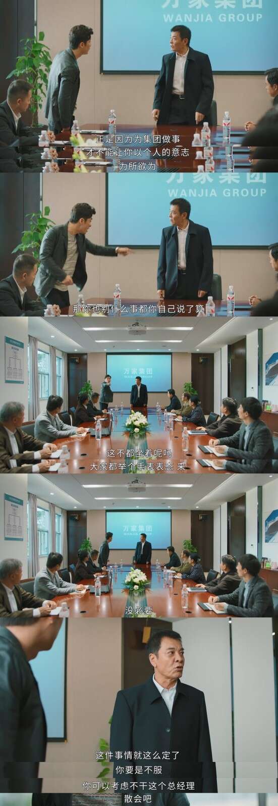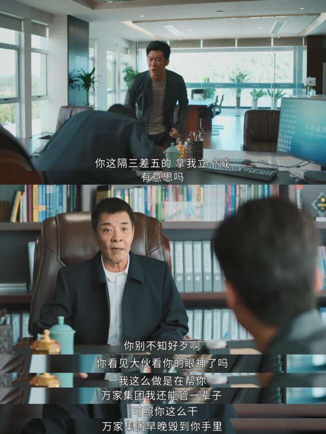 可在某些时候,万善堂还是会露出他的真面目——他本质是万家庄的“土皇帝”,他强势惯了。特别有意思的一幕是,他在大会上批评儿子“不能以个人意志为所欲为”。万传家当场顶嘴,“那你别什么事都你自己说了算”,儿子让在座的人投票。万善堂斩钉截铁地吼了一句,“没必要,这件事就这么定了”。