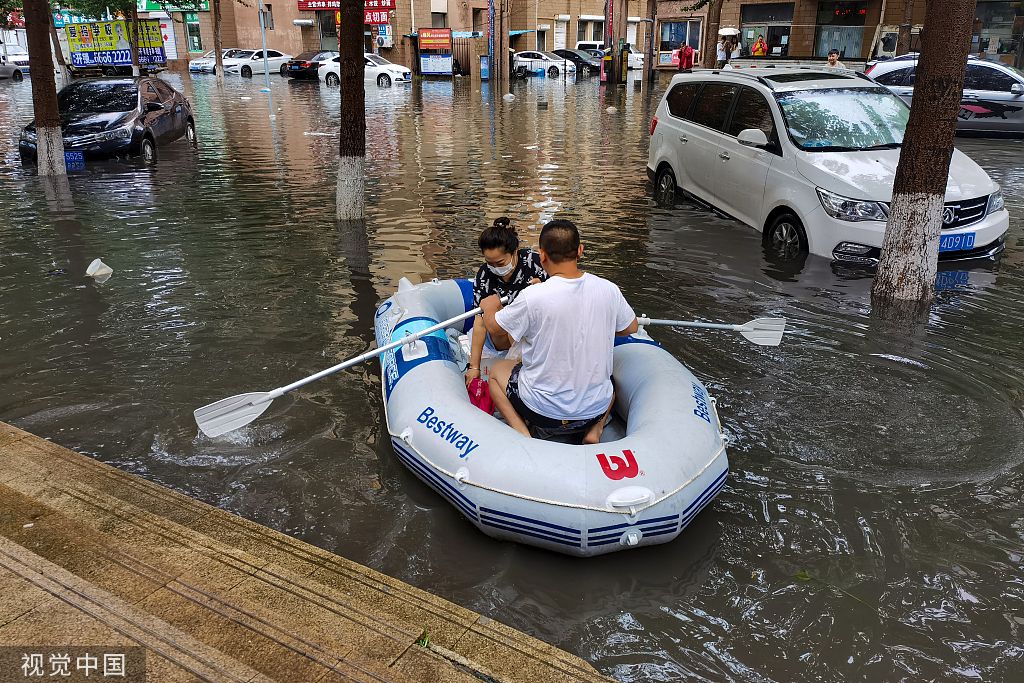 2022年7月7日,沈阳市凌晨至清晨出现了暴雨、局部大暴雨天气过程,造成局部地段积水影响出行。一对年轻夫妇划着皮划艇到对面的超市买早点,引来人们的关注。