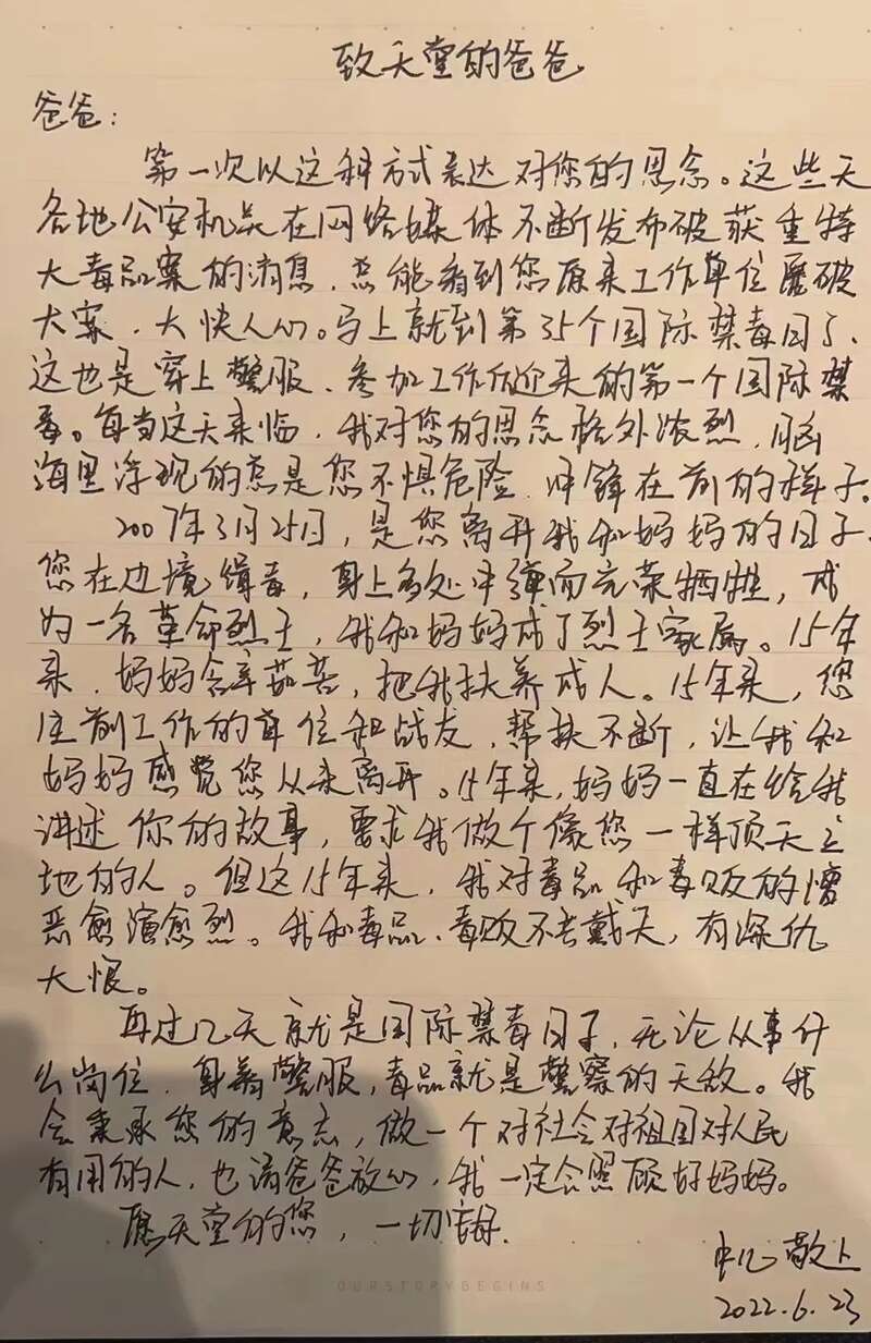 “无论从事什么岗位,身着警服,毒品就是警察的天敌,毒品一日不绝,禁毒一刻不止。”他在结尾写道,“我会秉承您的遗志,做一个对社会对祖国对人民有用的人。也请爸爸放心,我一定会照顾好妈妈。”