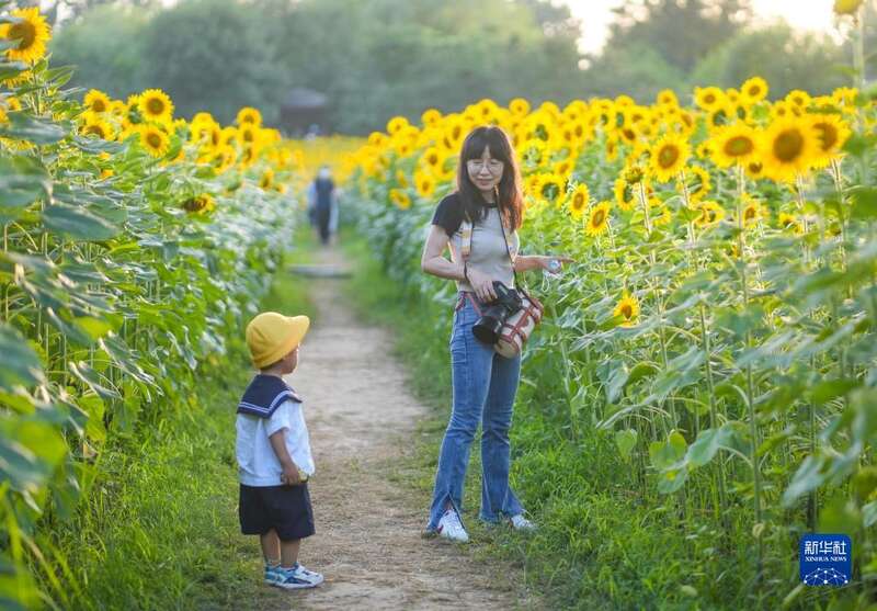 7月8日,一名家长带着孩子在北京奥林匹克森林公园北园的向日葵花田中拍照。