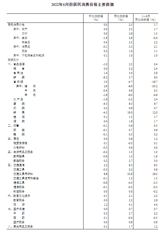 2022年6月份,全国居民消费价格同比上涨2.5%。其中,城市上涨2.5%,农村上涨2.6%;食品价格上涨2.9%,非食品价格上涨2.5%;消费品价格上涨3.5%,服务价格上涨1.0%。1—6月平均,全国居民消费价格比上年同期上涨1.7%。