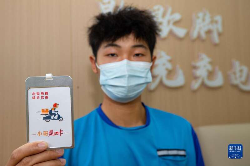 7月9日,在襄阳市襄城区古城北街商圈“红色驿站”,外卖小哥展示小哥爱心卡,凭借该卡可在北街商圈部分商家享受折扣优惠。