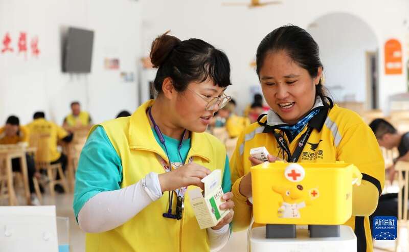 7月9日,在郯城县郯城街道龙泉社区“小哥食堂”,外卖骑手在便民药箱内取用防暑药品。