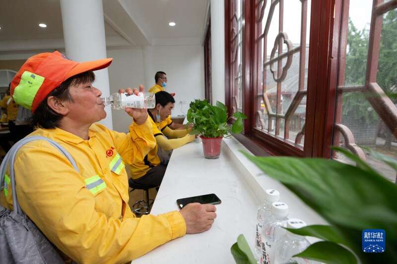 7月9日,环卫工人在襄阳市襄城区古城北街商圈“红色驿站”的“小哥加油站”休息。