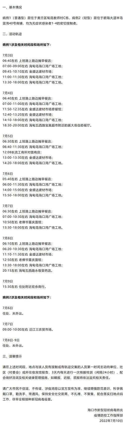 记者从海南省海口市新型冠状病毒肺炎疫情防控工作指挥部了解到,2022年7月10日晚,海口市新增2例新冠肺炎确诊病例,均在管控的密切接触者排查中发现。7月9日以来,累计发现确诊病例2例、无症状感染者8例。具体情况如下: