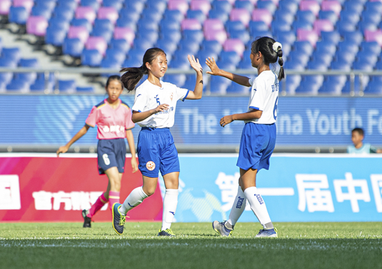 7月10日,在第一届中国青少年足球联赛(浙江赛区)女子小学U12组比赛中,杭州长阳小学的小球员彭紫萱(中)进球后与队友邓语菲击掌庆祝。当日,第一届中国青少年足球联赛启动仪式在杭州市黄龙体育中心举行。现场举行了小球员青训大纲展示、媒体通气会与中国青少年足球联赛的部分比赛。新华社记者 江汉/摄