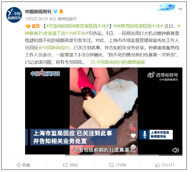 5日,一段网友用打火机点燃钟薛高雪糕疑似烧不化的视频再度引发关注。对此,上海市市场监督管理局宣传处工作人员回应,已关注到此事,并告知相关业务处室。