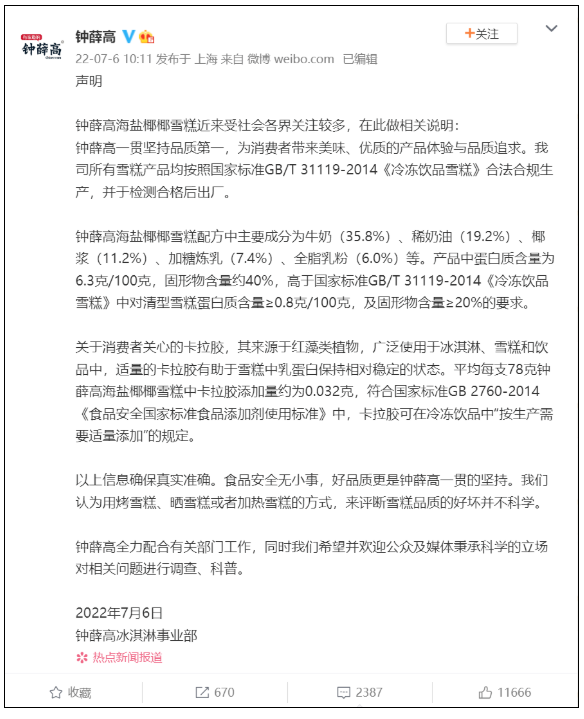 7月2日,@钟薛高 回应表示,为在货架期内保持产品的良好风味和形态,产品仅使用极少量的食品乳化增稠剂,均严格按照国家相关标准添加,可放心食用。
