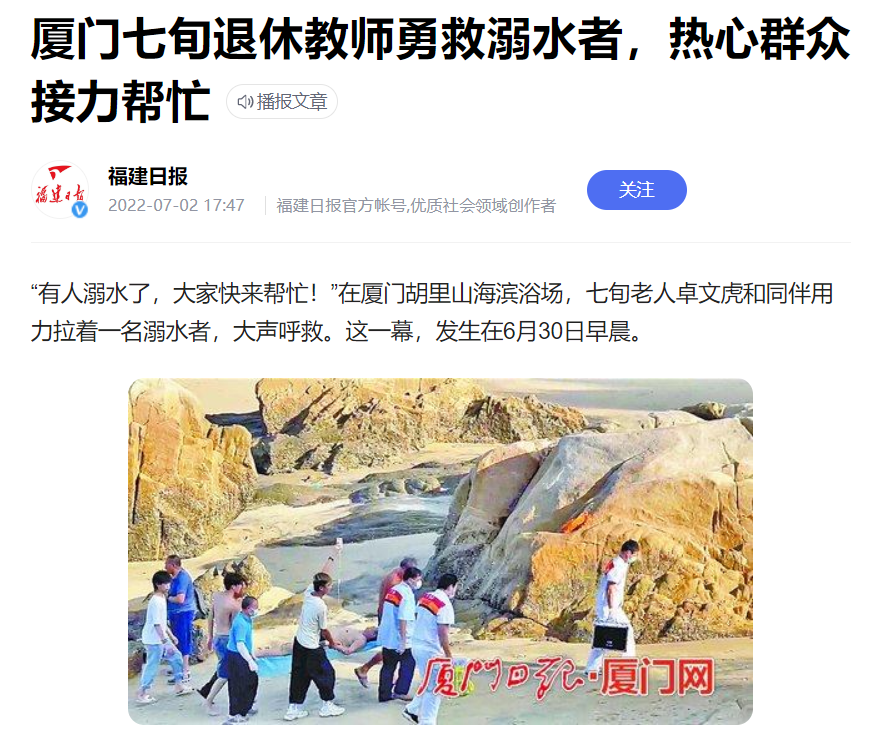 像这样见义勇为的行为,卓文虎并非第一次了,在他四十年的游泳生涯中,就曾经搭救过溺水者6次。2016年时,他搭救过来厦旅游的19岁甘肃姑娘。女孩在涨潮时被困在礁石上,在她大声呼救时,卓文虎让女孩扶住他的游泳圈,并将女孩拉向岸边。事后,女孩多次表达感谢。他还曾救过一对父子和一对母女,挽救了两个家庭。对于他来说,施以援手只是举手之劳,从不求回报。