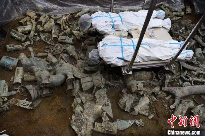 当前,三星堆新一轮考古发掘工作已临近尾声。在众多新出土的国之重器中,来自4号祭祀坑的3件扭头跪坐人像因造型写实、姿势奇特而备受关注。通过X光探测,这组展现人像为模范法整体浇铸成型,人像上交错V形纹、羽冠纹、燕尾纹皆为首次发现,生动展现了三千多年前古蜀写实雕塑艺术与三星堆青铜铸造艺术超高水平。