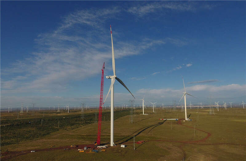 在河北张家口市张北县大河乡,工人在一处风电场安装风力发电机(2020年9月15日摄,无人机照片)。新华社记者 杨世尧 摄