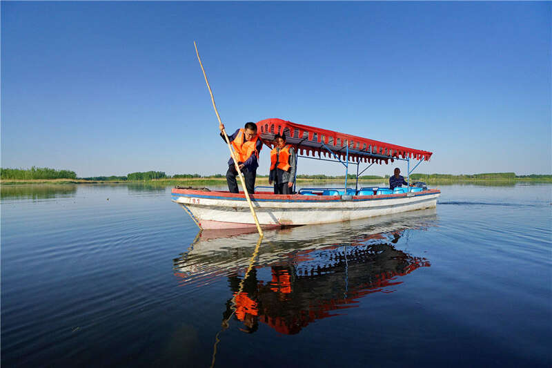 工作人员在白洋淀测量水位(2019年4月30日摄)。新华社记者 牟宇 摄