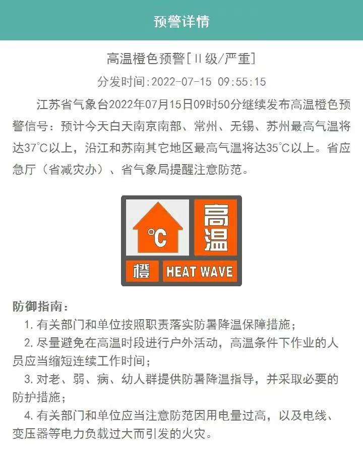 江苏省气象台2022年7月15日9时50分继续发布高温橙色预警信号:预计今天(15日)白天南京南部、常州、无锡、苏州最高气温将达37℃以上,沿江和苏南其他地区最高气温将达35℃以上。江苏省应急厅(省减灾办)、省气象局提醒注意防范。